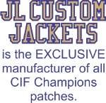 JL Custom Jackets is a licensed manufacturer for CIF Southern Section patches, including exclusive Champions patches you can't get anywhere else. We understand just how important your award is to you and what a great achievement it represents. That is why we are strongly committed to a high quality product with a quick turn around time.